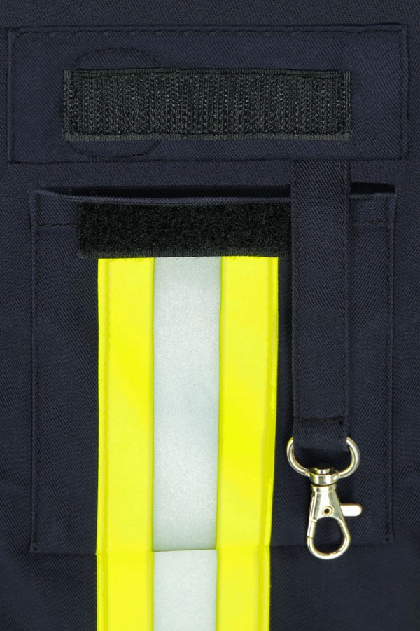 Paspel in leuchtgelb -Reflextreifen auf den Patten der Brusttschee -2,5 cm breit , mit Paspel an der Unterkante in leuchtgelb .